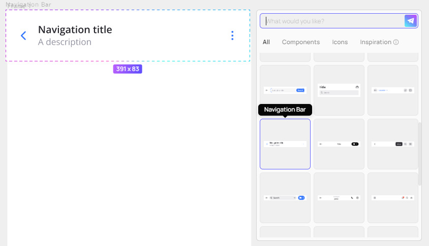 영역을 지정하면 해당영역에 어울리는 디자인 component 를 생성해준다!! 우리가 원하는 UI 를 고르기만 하면 끝!