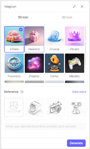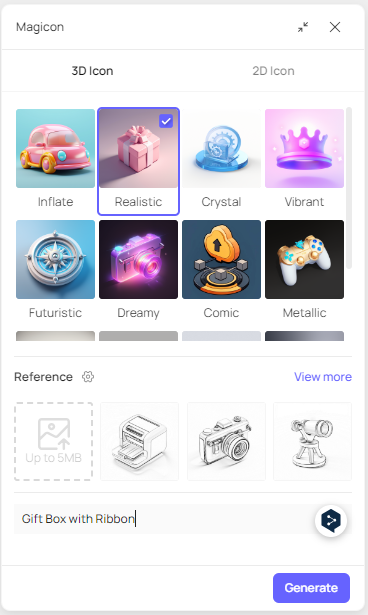 3D , 2D 아이콘을 생성할수있고, 레퍼런스 이미지도 업로드 할수있다.