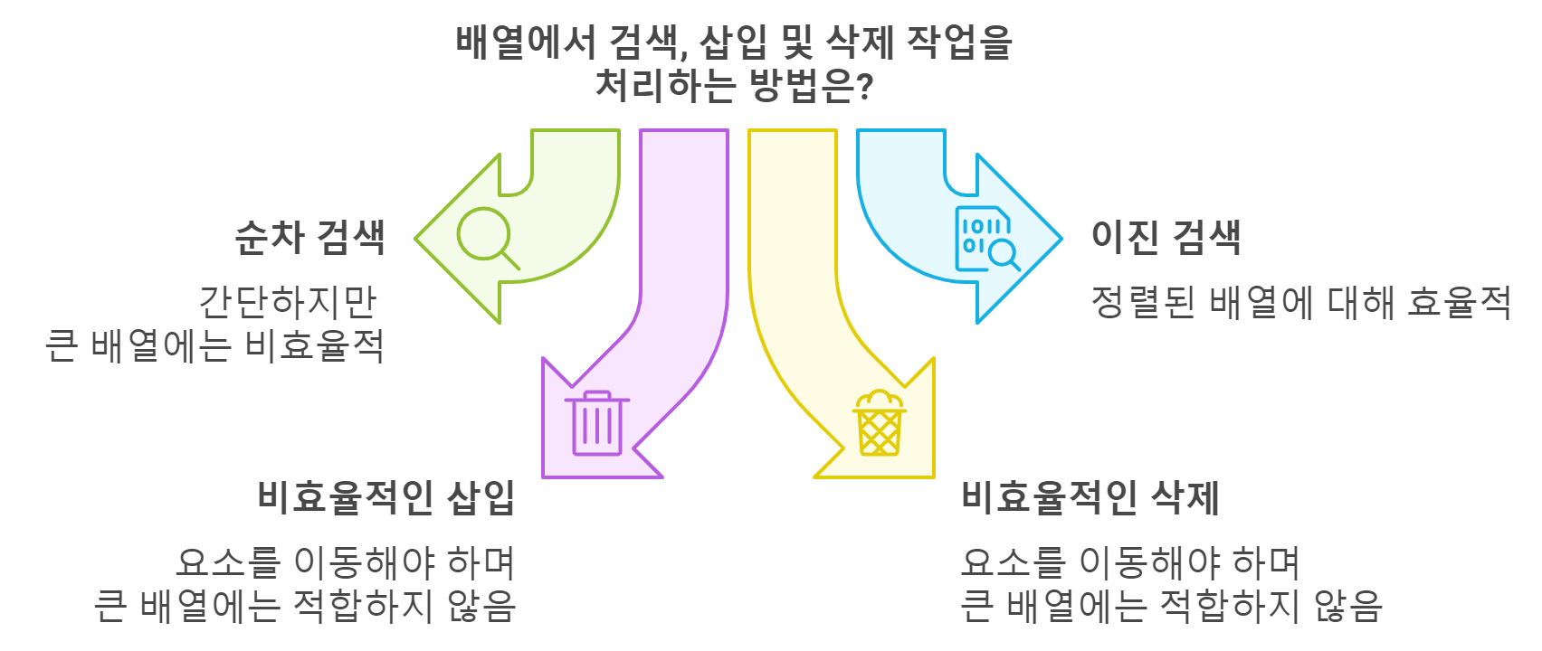 배열에서 요소를 삭제할 경우, 삭제된 요소 뒤에 있는 모든 요소를 한 칸씩 앞으로 이동해야 합니다. 이 때문에 삭제 연산도 배열에서 효율적이지 않을 수 있습니다.