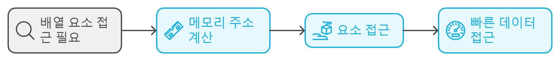 배열은 메모리에서 연속된 위치에 저장되며, 배열의 각 요소는 고정된 크기를 가지므로 특정 요소에 접근하기 위해서는 시작 주소에 인덱스와 요소 크기를 곱해 계산할 수 있습니다. 예를 들어, int 타입의 배열의 경우 각 요소의 크기는 4바이트입니다. 배열의 인덱스를 통해 이러한 연산이 간단히 이루어지기 때문에 데이터 접근 속도가 매우 빠릅니다.