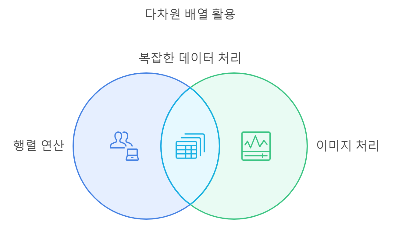 배열은 다차원으로 확장할 수 있으며, 2차원 이상의 배열은 행렬 연산이나 이미지 처리와 같은 복잡한 데이터를 다룰 때 매우 유용합니다. 예를 들어, 게임에서 맵 데이터를 저장하거나, 그래픽 이미지의 픽셀 데이터를 저장하는 데 2차원 이상의 배열을 사용할 수 있습니다. 이러한 다차원 배열을 통해 보다 복잡한 데이터 구조를 효과적으로 표현하고 관리할 수 있습니다.