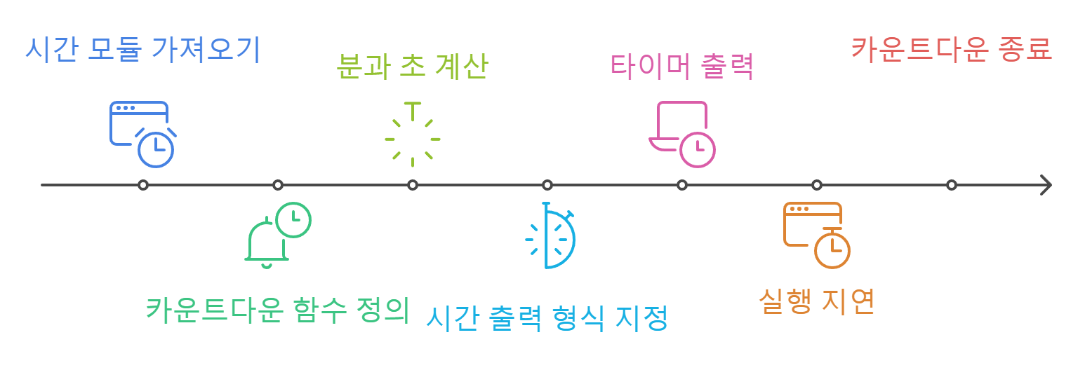 카운트다운 타이머를 구현하기 위해 파이썬에서 제공하는 time 모듈을 사용하게 됩니다. time 모듈은 시간과 관련된 여러 가지 기능을 제공하며, 여기서는 time.sleep() 함수를 활용하여 프로그램을 일정 시간 동안 대기시킬 것입니다.