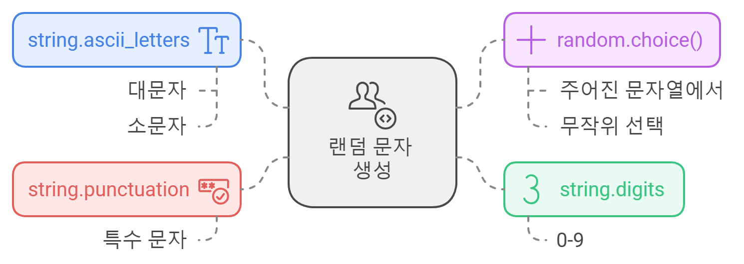 - string.punctuation: 특수문자를 포함하여 보안을 강화합니다.