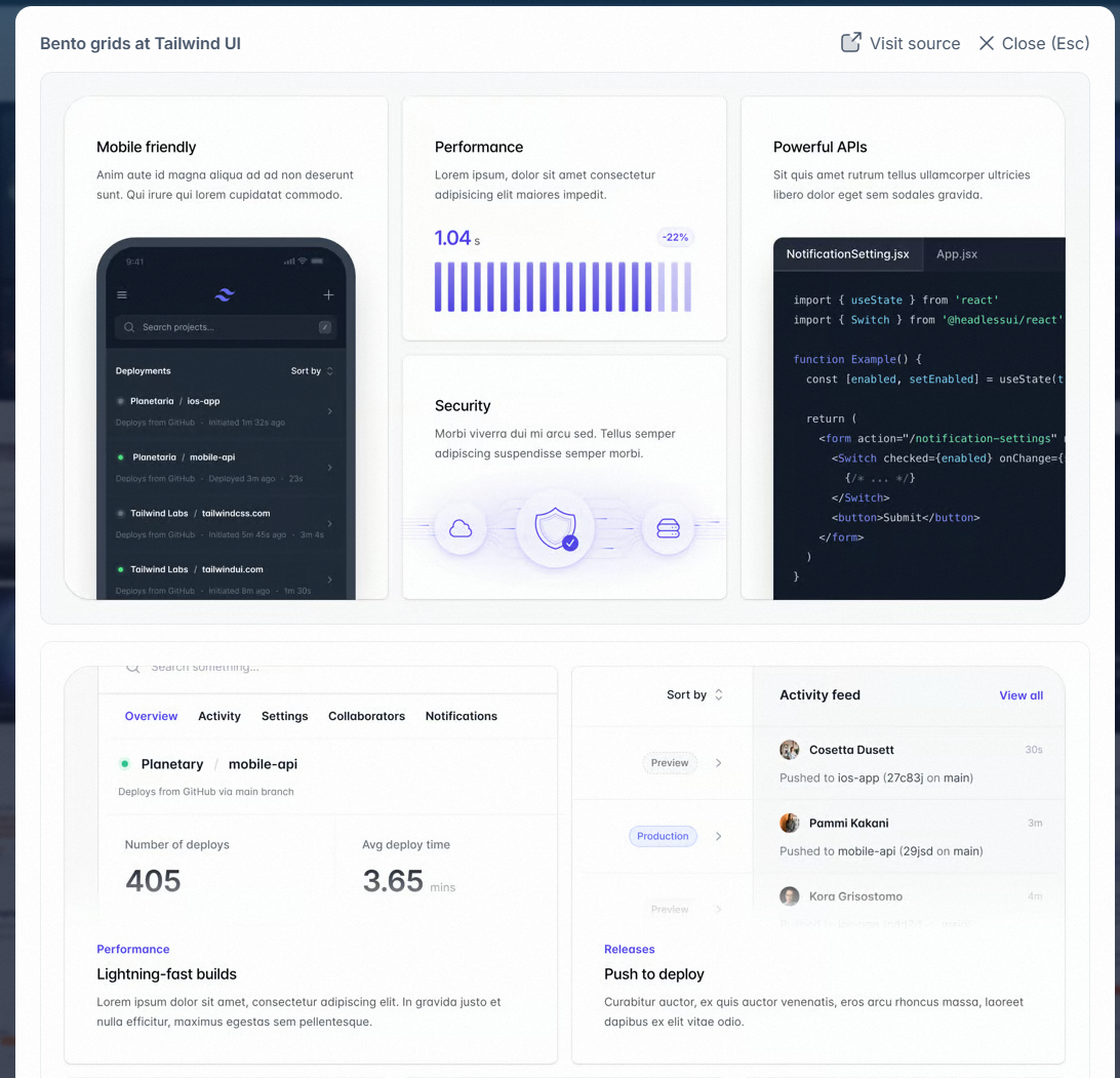 | 앱 UI | ✅ bento grid UI 패턴 요소들을 확인 및 소스 받을수있음 |