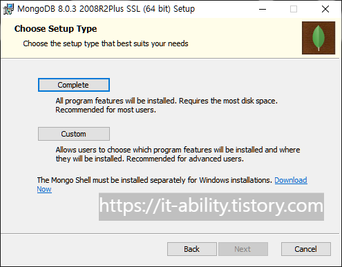 - Complete 를 눌러 줍니다. ( mongoDB Compass 설치 포함 : Compass 는 GUI 툴로 쉽게 사용가능합니다. )