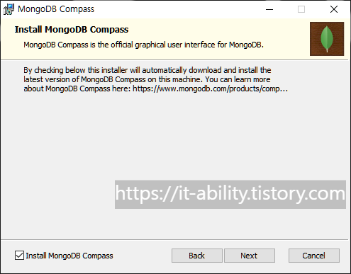 - Compass 설치 를 희망하시면 체크하고 Next 눌러 줍니다. ( Compass 는 GUI 툴로 직관적으로 DB 접속할수있습니다 )