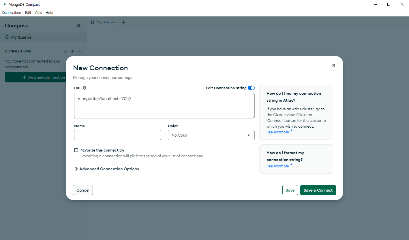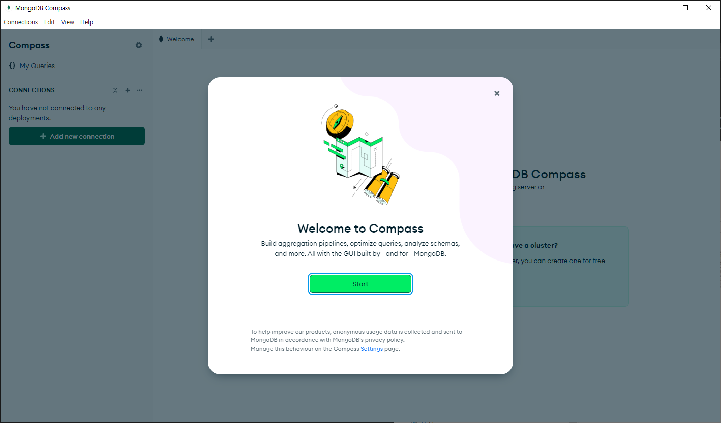 MongoDB Compass는 데이터베이스를 시각적으로 관리할 수 있는 GUI 도구입니다. 설치 과정에서 함께 설치했다면, Compass를 실행하여 로컬 데이터베이스에 연결해 보세요. Compass를 통해 데이터 구조를 탐색하고, CRUD 작업을 쉽게 수행할 수 있습니다.