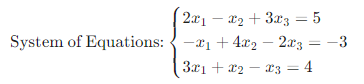 $$\begin{cases} 2x_1 - x_2 + 3x_3 = 5 \\ -x_1 + 4x_2 - 2x_3 = -3 \\ 3x_1 + x_2 - x_3 = 4 \end{cases}$$