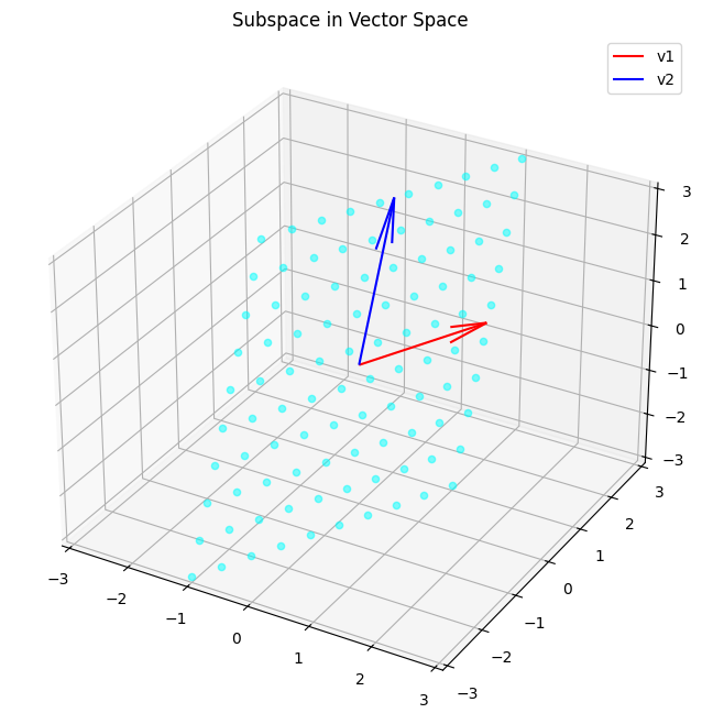 - 부분 공간: 벡터 공간의 부분 집합으로, 영벡터를 포함하며 벡터 덧셈과 스칼라 곱셈에 대해 닫혀 있는 집합입니다.
