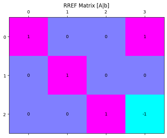 예제:\[ \begin{bmatrix} 1 & 0 & 0 & 1 \\ 0 & 1 & 0 & 0 \\ 0 & 0 & 1 & -1 \end{bmatrix} \]