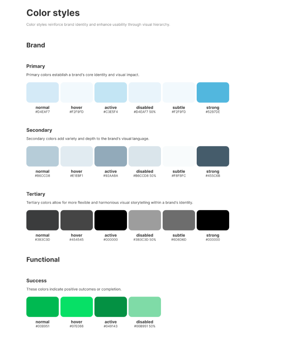 💡예시: 브랜드 색상 코드, 메인·보조 폰트, UI 컴포넌트 사용 규칙 등을 정리해 모든 디자이너와 개발자가 참고하도록 합니다.