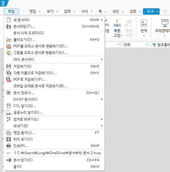 | 최근 작업 문서 | Alt+F3 | |