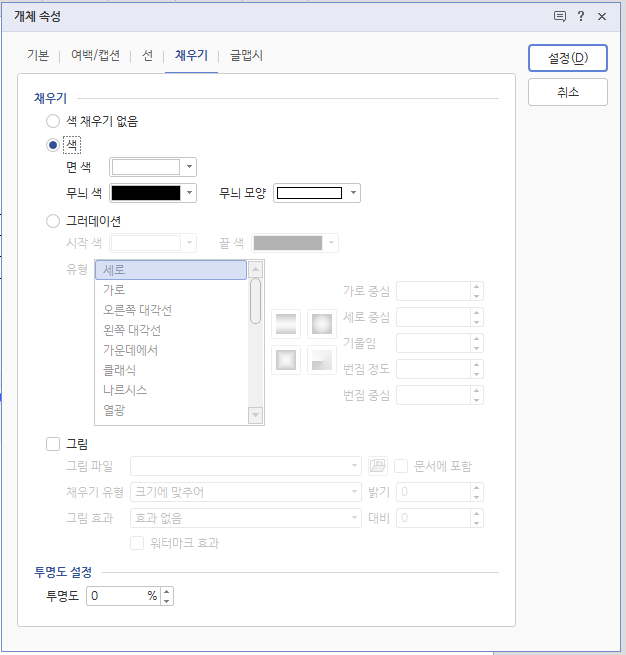 | 배경 속성 | C | (빠른 메뉴)개체 속성-채우기 탭 |