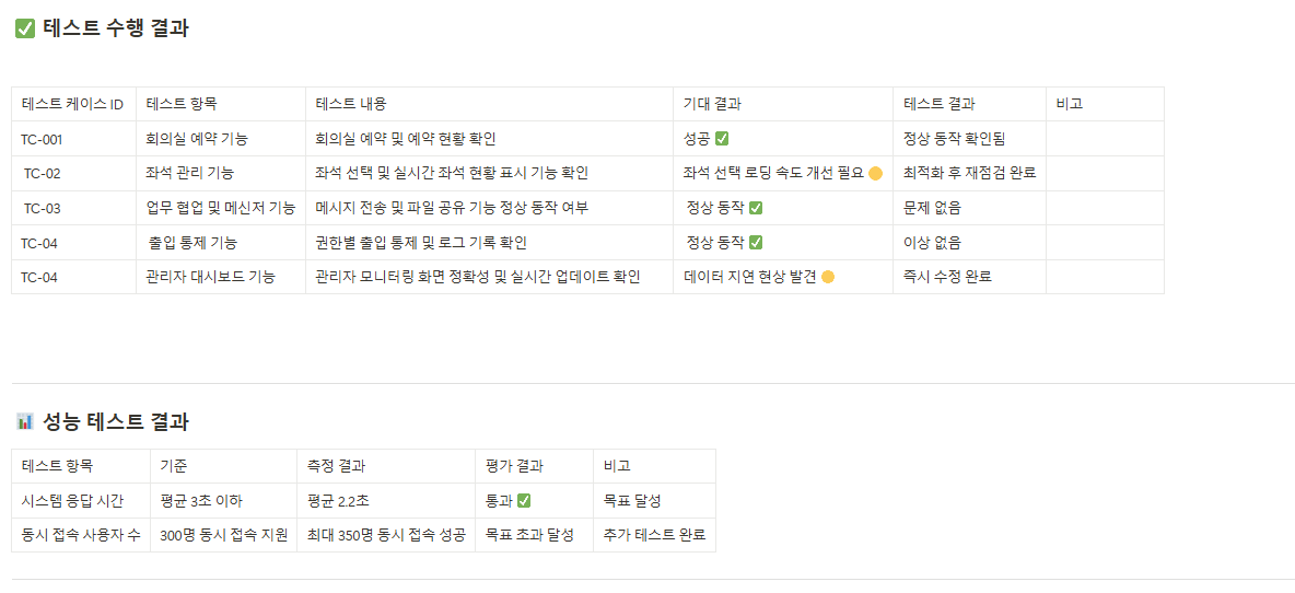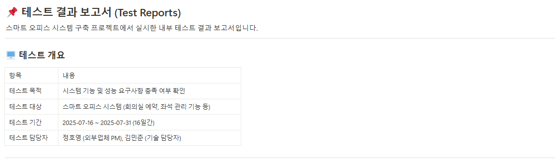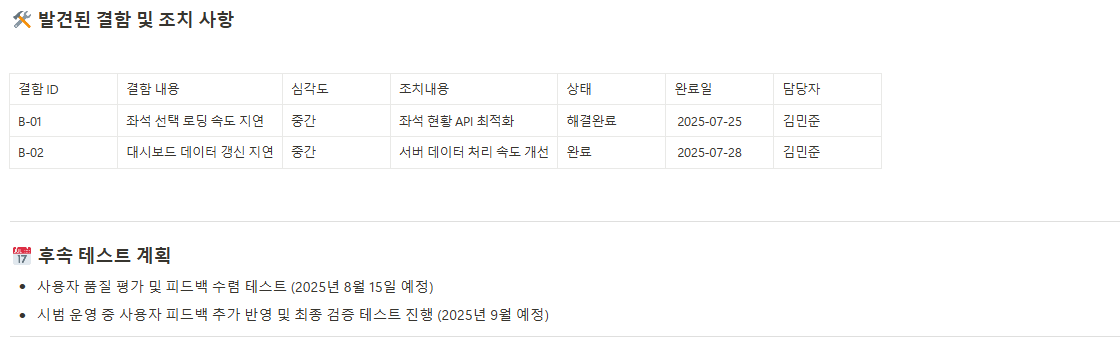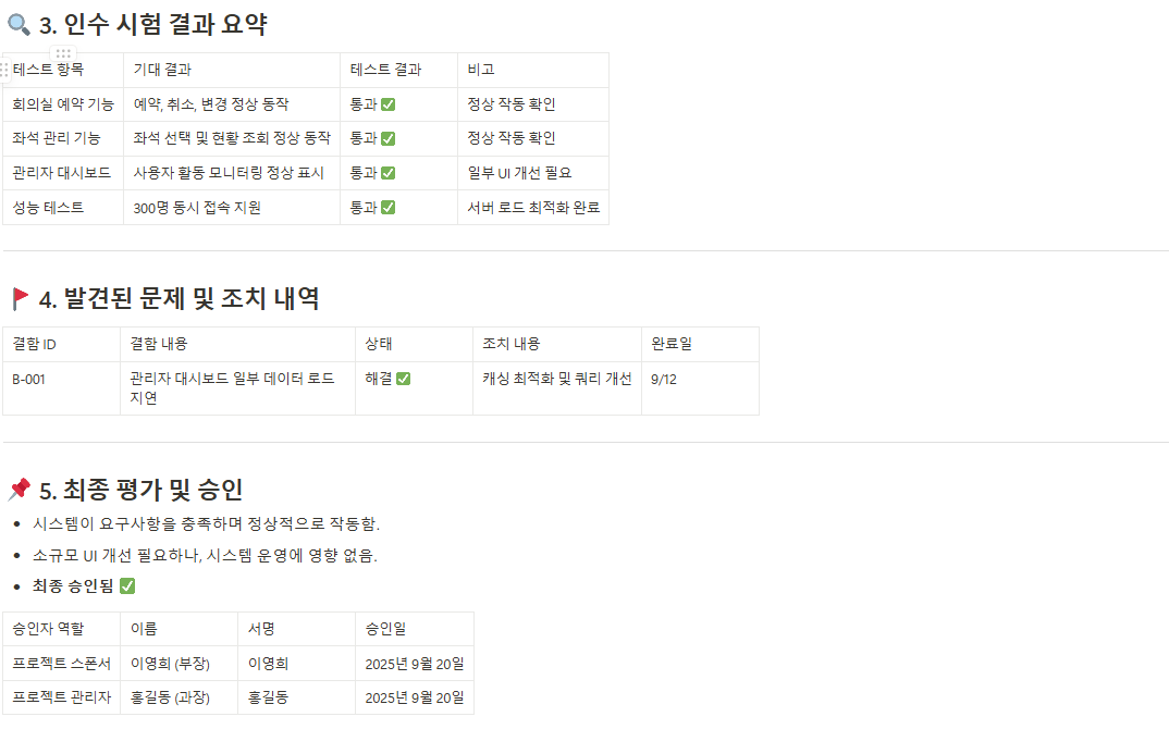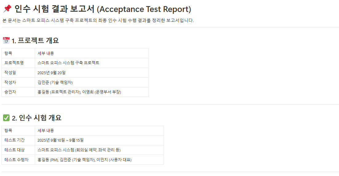 개발 중인 제품이나 결과물이 정해진 품질 기준을 충족하는지 테스트한 결과와 문제 발생 시 개선사항을 문서화하여 품질 관리를 강화합니다. - 인수 시험 결과 보고서(Acceptance Test Report)