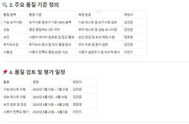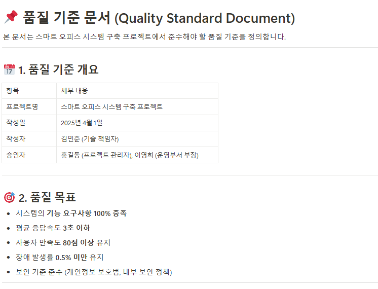 프로젝트의 결과물이 충족해야 할 품질 기준을 명확히 정의하여 모든 참여자가 동일한 기준으로 업무를 수행하도록 합니다. - 품질 보증 계획서(Quality Assurance Plan)