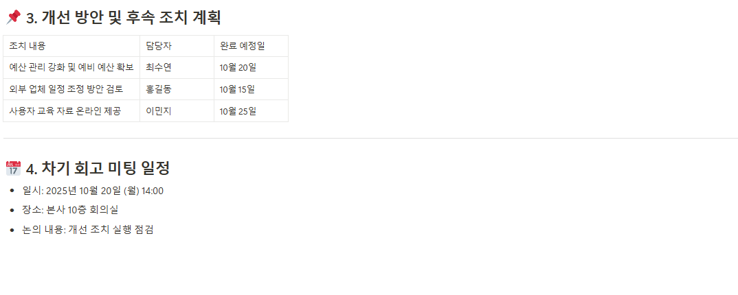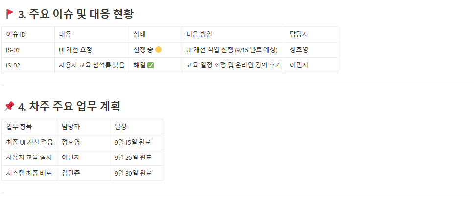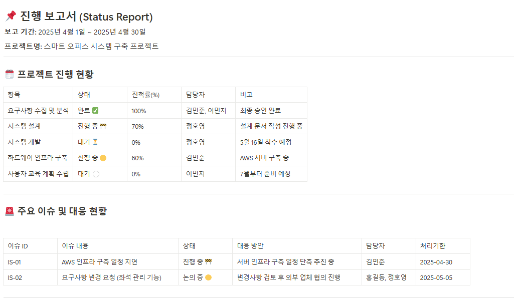 주간 회의, 검토 회의 등 프로젝트 관련 회의에서 논의된 사항과 결정사항을 명확히 기록하여 업무의 혼선을 방지하고 책임 소재를 명확히 합니다. - 업무 공유 리포트(Status Report)