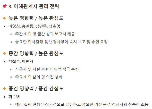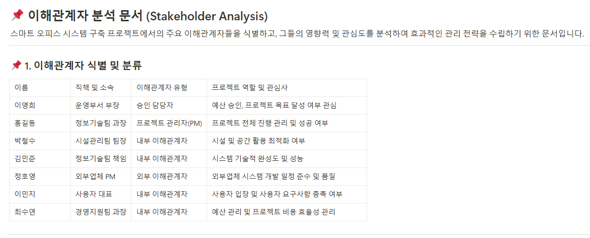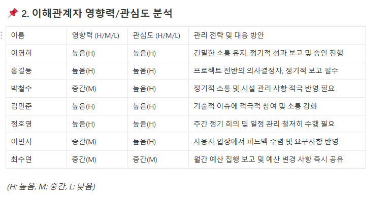 프로젝트와 연관된 이해관계자를 식별하고, 이해관계자의 기대, 요구사항, 영향력 등을 명시하여, 프로젝트 초기에 발생할 수 있는 리스크를 사전에 관리할 수 있게 합니다.