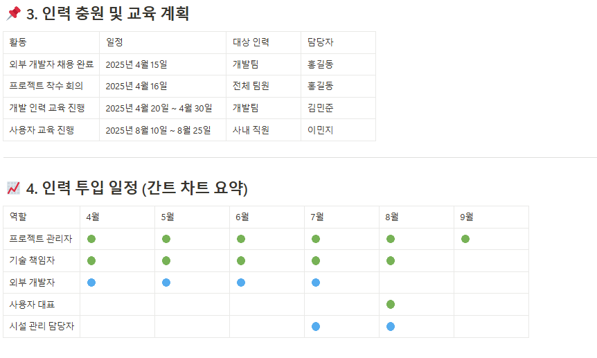 프로젝트 진행 시 필요한 인력의 역할, 책임, 배치 시기 및 투입 기간을 정리하여 인력 관리에 대한 명확한 기준을 제공합니다.
