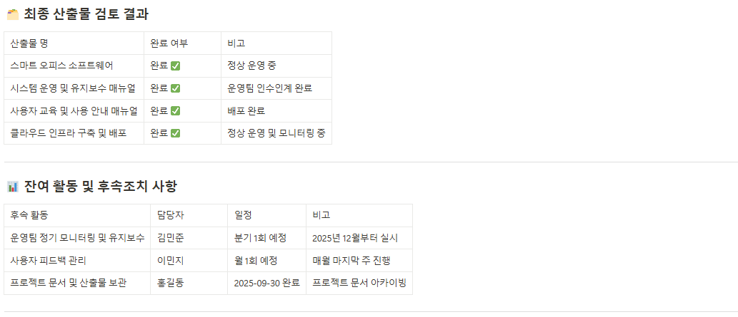 잘 정리된 산출물과 문서들은 단순히 프로젝트 하나의 성공에만 기여하는 것이 아니라, 조직 차원의 지식 자산으로 축적되어 향후 프로젝트 진행 시 중요한 참고 자료로 활용됩니다. 따라서 각 프로세스별 문서화와 산출물 관리에 보다 체계적이고 적극적인 접근이 필요합니다.