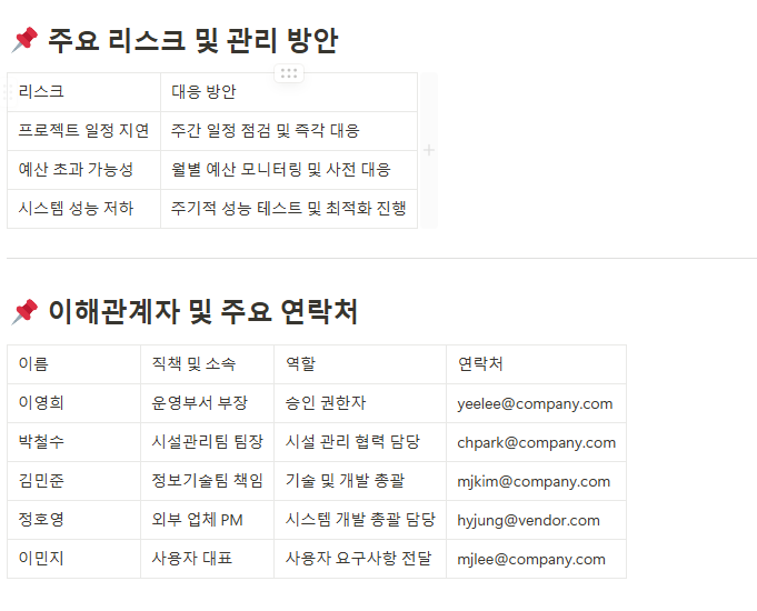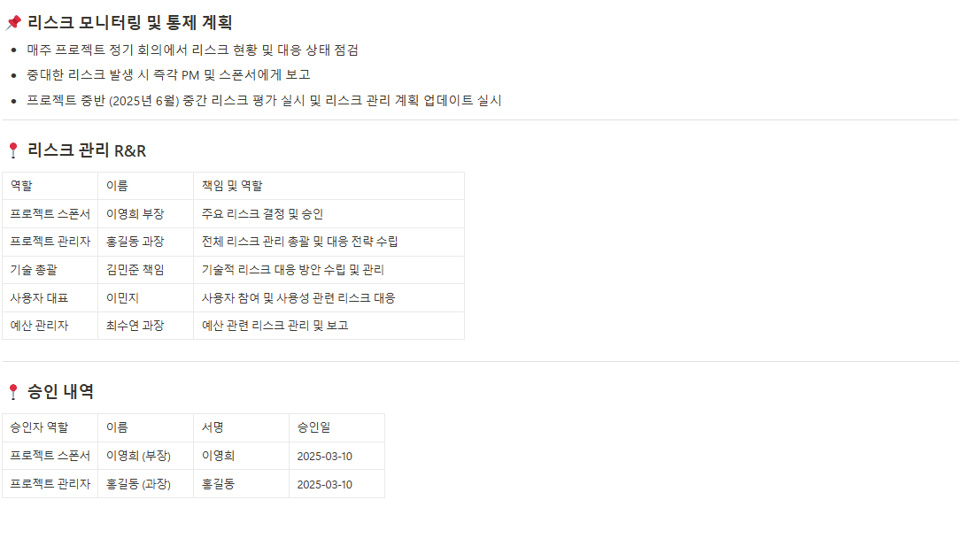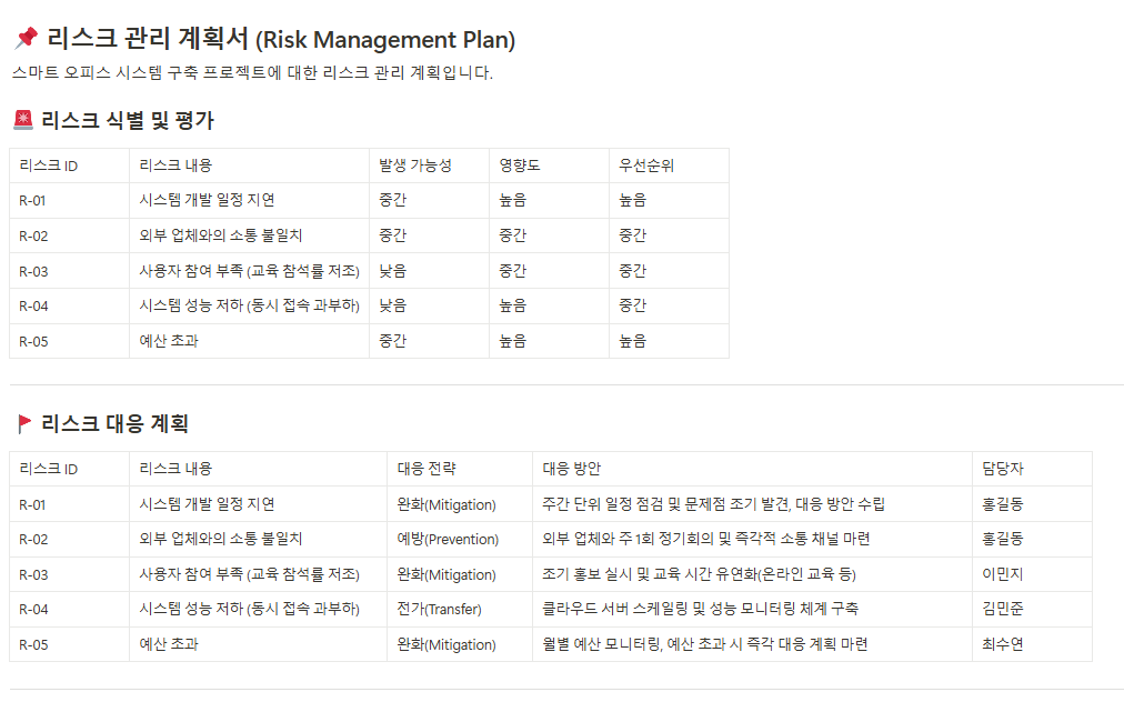 프로젝트 중 발생 가능한 리스크를 모두 식별하여 기록하고, 리스크 발생 시 대응책을 사전에 명확하게 정의합니다. - 위험 대응 전략 문서(Risk Response Plan)