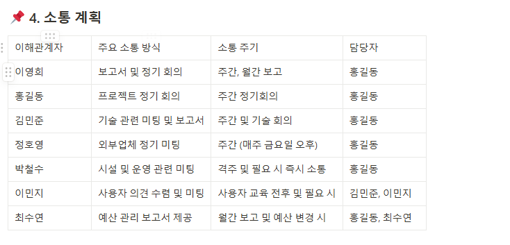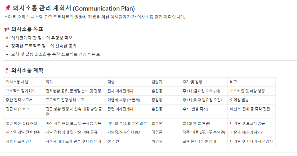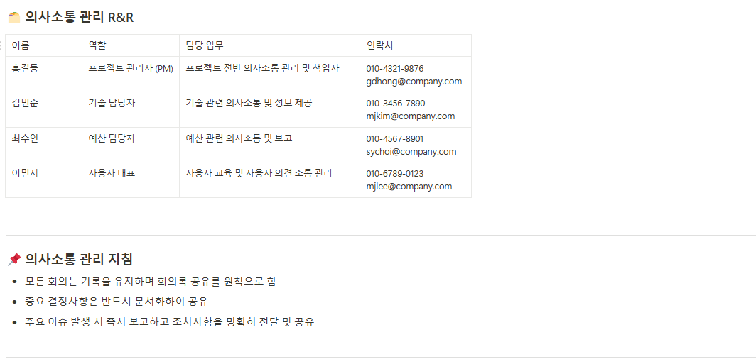 프로젝트 이해관계자 간의 정보 공유 방식을 명확히 정의하고, 보고 체계, 보고 주기, 담당자를 명시하여 효율적인 소통과 협업을 가능하게 합니다.
