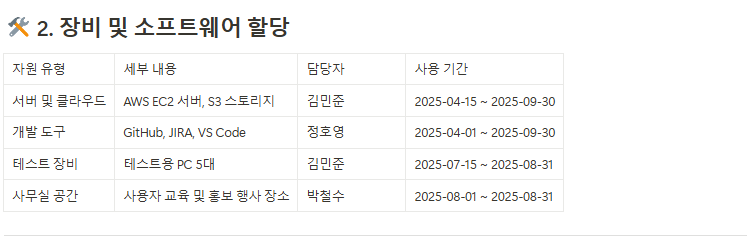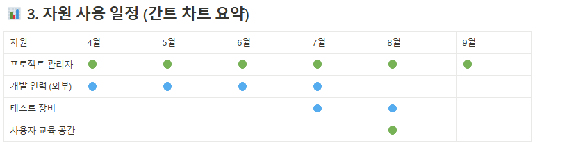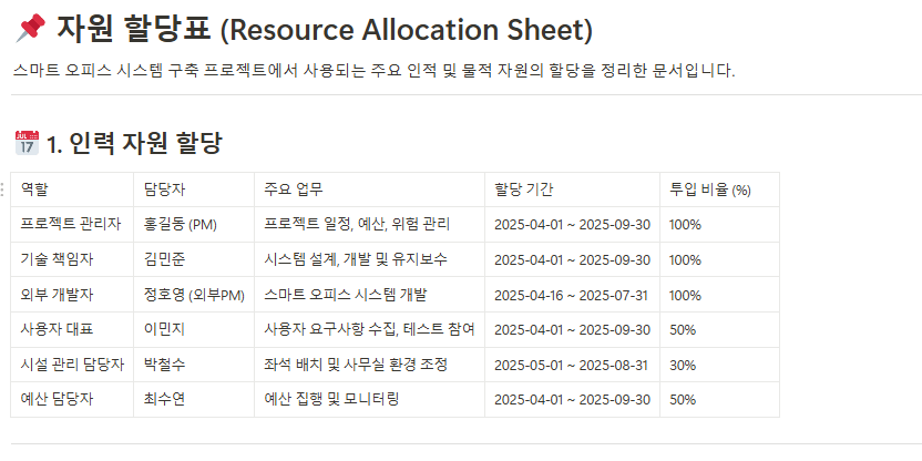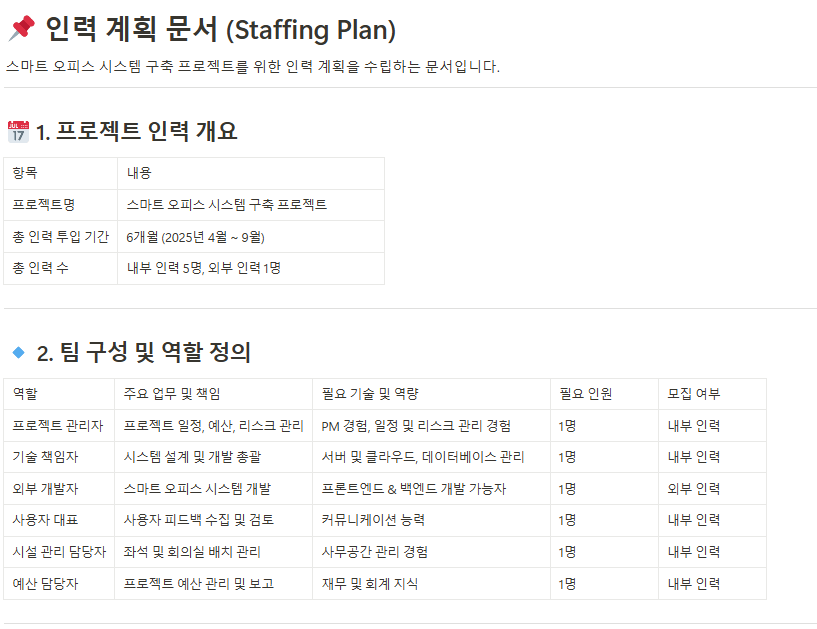 프로젝트 업무별로 필요한 인력과 자원을 명확히 할당하여 자원의 과부족을 방지합니다. - 인력 계획 문서(Staffing Plan)