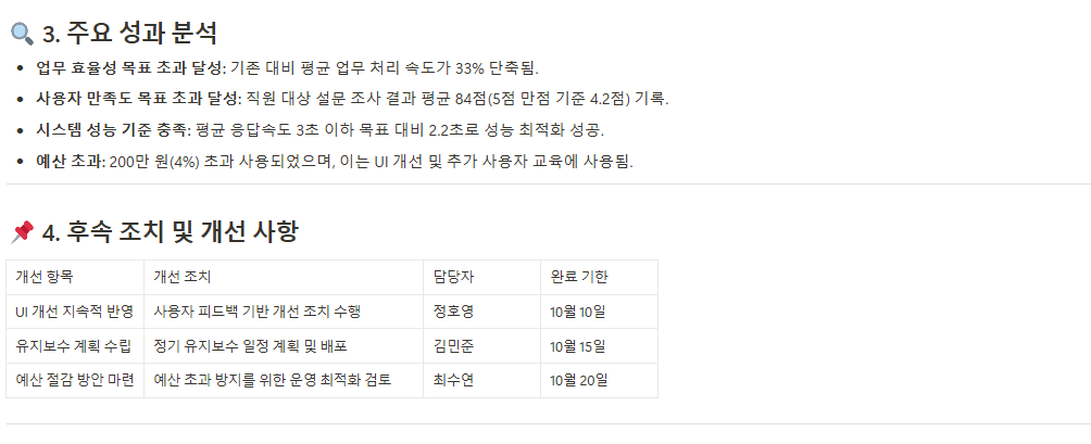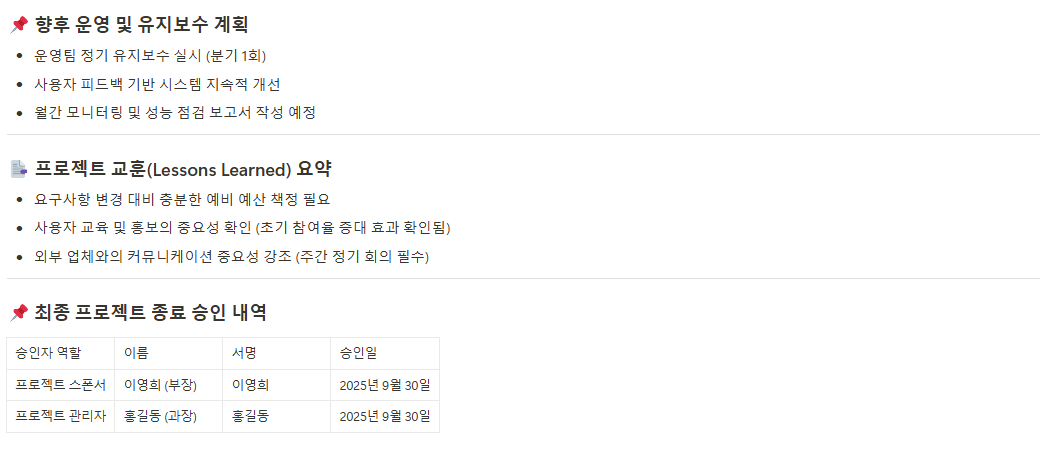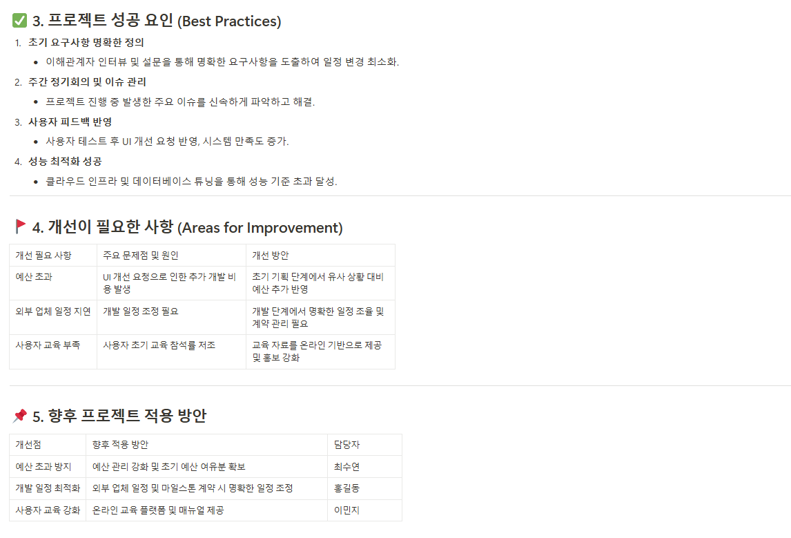 프로젝트 수행 과정에서 발생했던 문제점과 그 원인을 분석하고, 잘된 점과 미흡했던 점을 정리하여 향후 유사 프로젝트 진행 시 개선할 수 있도록 교훈과 개선 방안을 명확히 기록합니다.