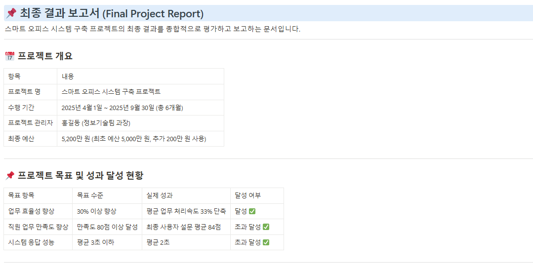 프로젝트 수행 결과를 정리한 종합 보고서로, 프로젝트 목표 달성 여부, 일정 및 예산 준수 여부, 주요 성과와 발생된 문제점 및 해결 방법 등을 문서화하여 공식적인 프로젝트 종료를 선언합니다.