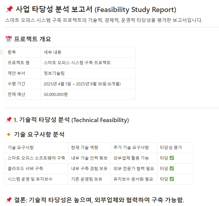 프로젝트의 경제성, 기술적 가능성, 시장성 등을 종합적으로 분석하여 프로젝트를 추진할 가치가 있는지 객관적으로 평가합니다. 이 문서는 프로젝트 진행 여부를 결정하는 중요한 근거자료가 됩니다.