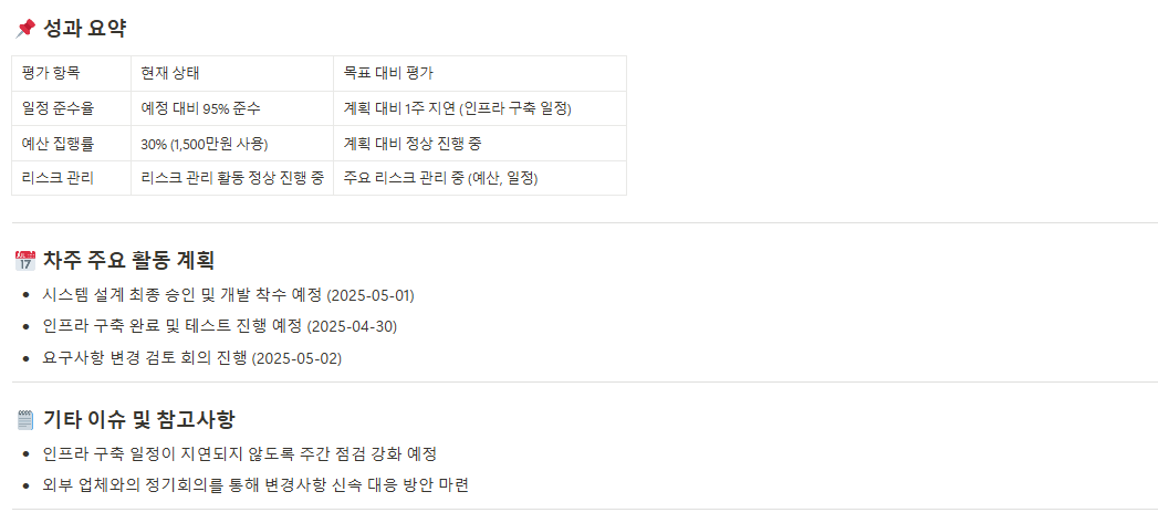 프로젝트 진행 상황, 완료된 업무, 진행 중인 업무, 지연 사항 등을 매주 정리하여 모든 이해관계자가 진행 현황을 명확히 파악할 수 있게 합니다.