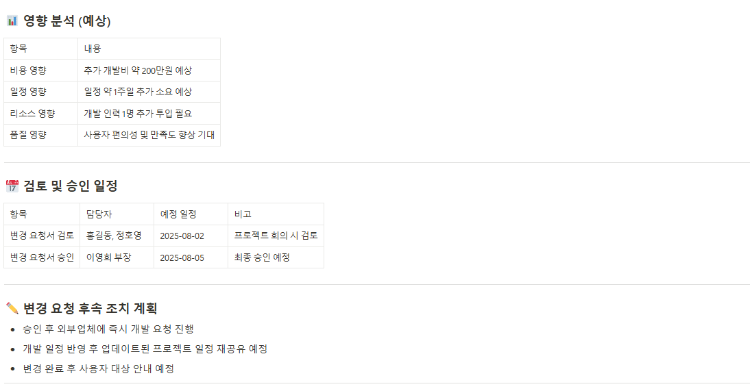 프로젝트 계획이나 범위에 대한 변경 요청 시 변경 사유, 영향 분석, 예상 결과 등을 문서화하여 공식적인 승인 과정을 거치도록 합니다.