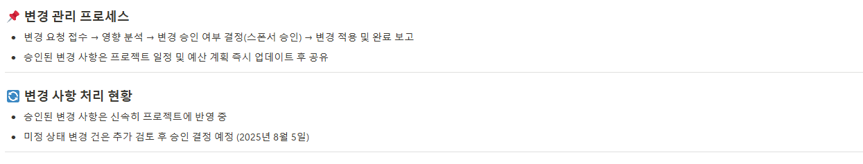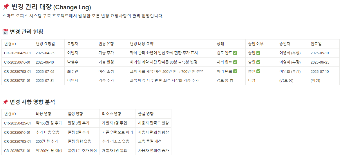 승인된 변경 사항을 기록하고 변경 전후 상황을 명확히 관리하여 변경사항이 프로젝트 진행에 미치는 영향을 철저히 모니터링합니다.