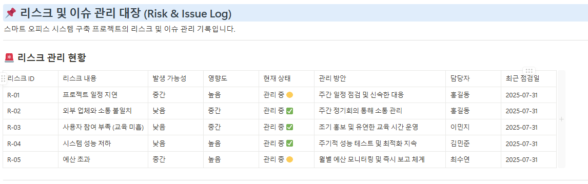 프로젝트 수행 중 예상되거나 새롭게 나타나는 위험 요소를 지속적으로 모니터링하여 위험 발생 시 신속한 대응을 가능하게 합니다.