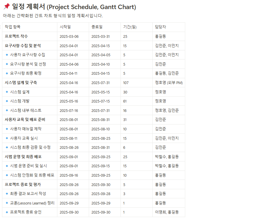 프로젝트 일정을 시각적으로 표현한 도구로, 업무 일정, 수행 기간, 업무 간 의존성을 한눈에 확인할 수 있도록 합니다. - 일정 계획서(Schedule Management Plan)
