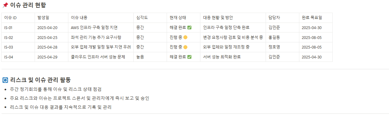 프로젝트 수행 과정에서 발생한 각종 문제점과 이슈를 기록하고, 책임자와 해결 일정, 결과를 명시하여 신속한 대응과 효율적인 관리를 가능하게 합니다.