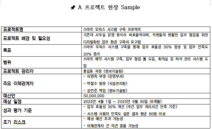 프로젝트 헌장은 프로젝트의 목적과 목표, 주요 이해관계자, 범위 및 제약 사항 등을 간략하고 명확하게 기술한 문서로서 프로젝트의 공식적인 시작을 알리는 역할을 합니다.
