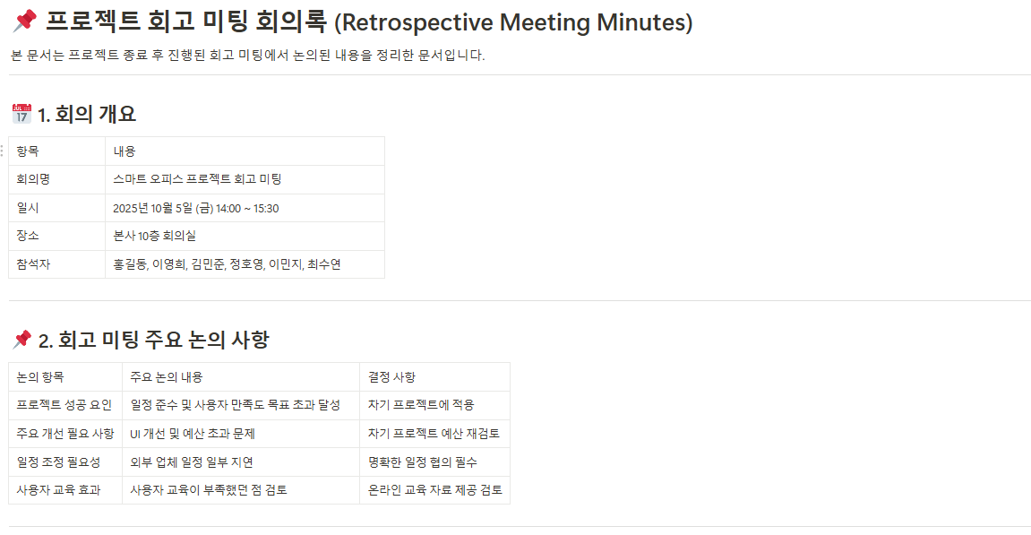 프로젝트 종료 시 프로젝트 참여자들이 모여 진행한 회고 미팅의 내용을 기록합니다. 미팅에서 논의된 프로젝트 성공 요인과 실패 요인, 그리고 향후 프로젝트를 위한 개선사항 등을 문서화하여 실질적인 교훈을 공유할 수 있도록 합니다.
