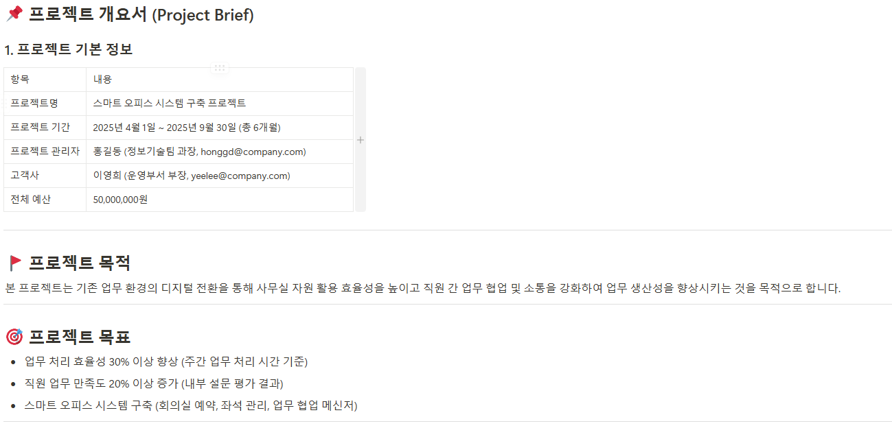 프로젝트 개요서는 프로젝트의 배경, 기대 효과, 주요 일정 및 추진 전략 등 전반적인 개요를 정리한 문서로, 이해관계자들이 프로젝트를 쉽게 이해할 수 있도록 도와줍니다.