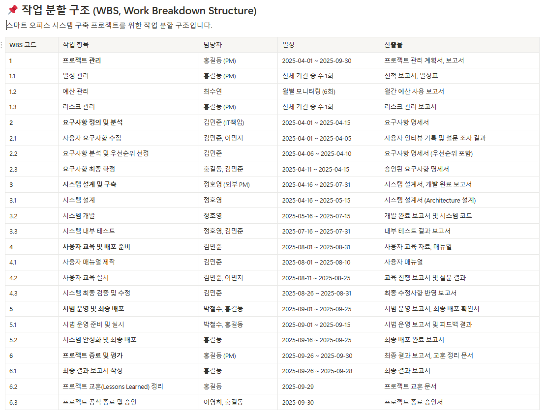 프로젝트를 관리 가능한 작은 단위로 나누어 명확히 정리한 구조도이며, 업무의 범위와 책임을 명확히 하는 데 도움을 줍니다.