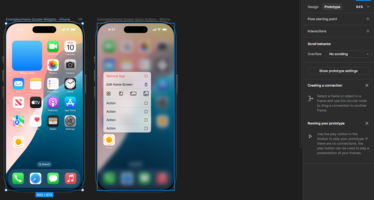 기본적으론, Frame 툴(F 단축키)로 기기별 해상도에 맞는 프레임을 생성합니다. iOS / Android 프리셋을 사용하면 스크롤 영역까지 자동으로 포함되어 편리합니다.