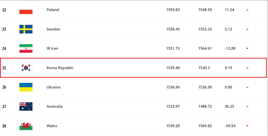 현재 우루과이의 피파랭킹은 16위 이고, 한국의 피파랭킹은 25위이며 두 나라의 랭킹차이는 9위 이다.