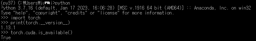 위와 같이 True 가 나오면 cuda 사용가능한 상태입니다.