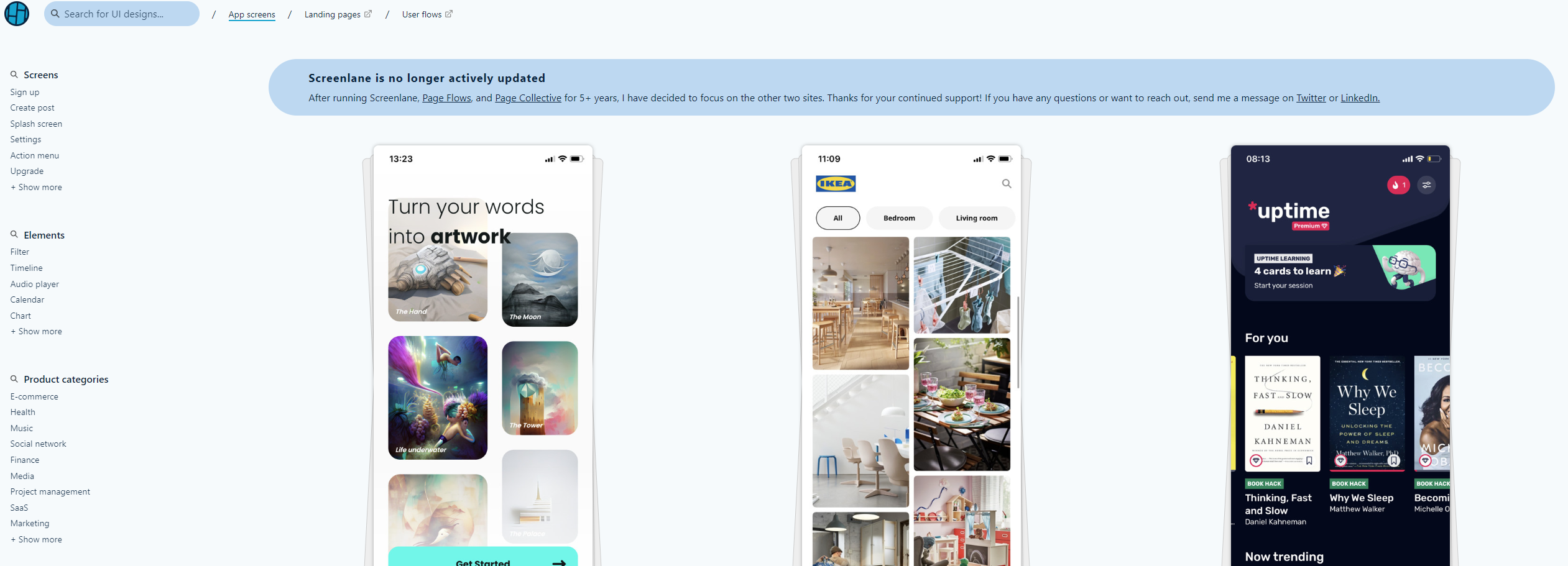 Screenlane은 최신 모바일 UI 디자인 아이디어를 매주 무료로 업데이트하여 메일함으로 직접 전송하는 웹사이트입니다. 엄선된 UI 디자인 패턴과 예제를 통해 모바일 플랫폼의 최신 디자인 트렌드와 영감을 얻을 수 있으며, 이 분야에 관심이 있는 29,458명 이상의 디자이너 및 제품 담당자와 함께할 수 있습니다. 이 사이트의 가장 좋은점은 실제 서비스 되는 앱, 웹 의 화면을 볼수있다는 것 입니다.