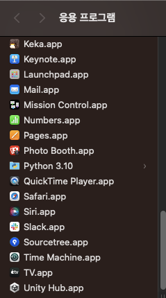 응용프로그램 맨밑에 보면 Unity Hub.app 이 생성된걸 확인할 수 있습니다.