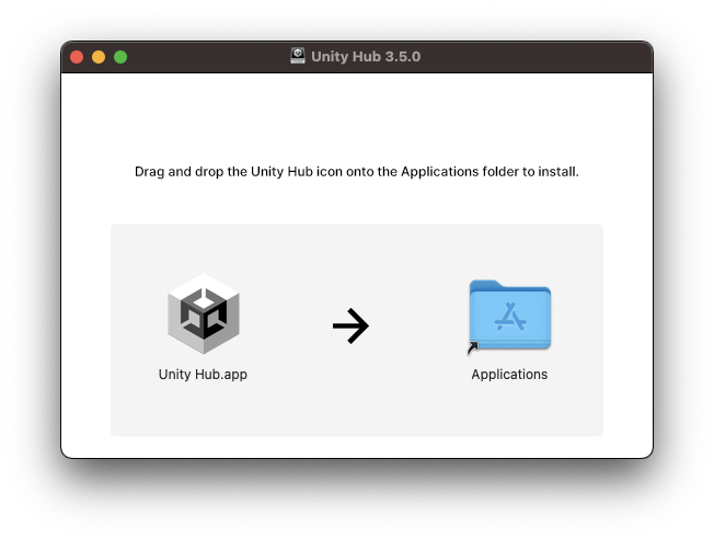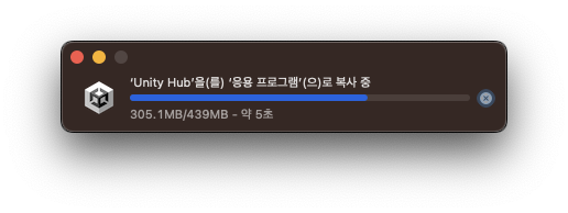기다리면 다음과 같은 화면이 나옵니다. Unity Hub.app 아이콘을 마우스로 드래그하여 Applications 에 옮겨줍니다.