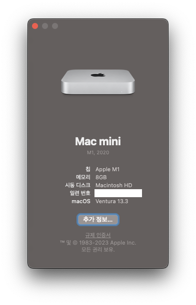 먼저 , 제 사양은 Mac Mini M1 기본형 이고 macOS 는 ventura 13.3 입니다.