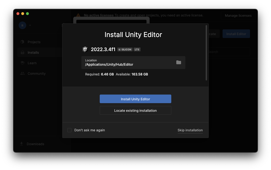 접속후 이런화면이 나옵니다. Install Unity Editor 클릭해줍니다.
