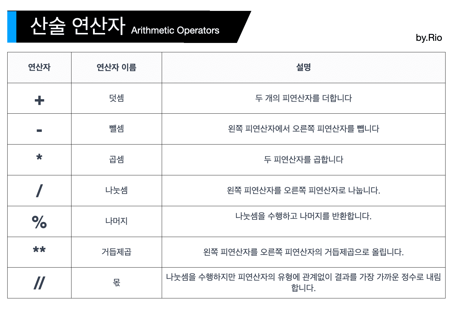 이 블로그 포스팅에서 살펴본 것처럼 덧셈(+), 뺄셈(-), 곱셈(*), 나눗셈(/), 나머지(%), 거듭제곱(**), 몫(//) 등의 연산자는