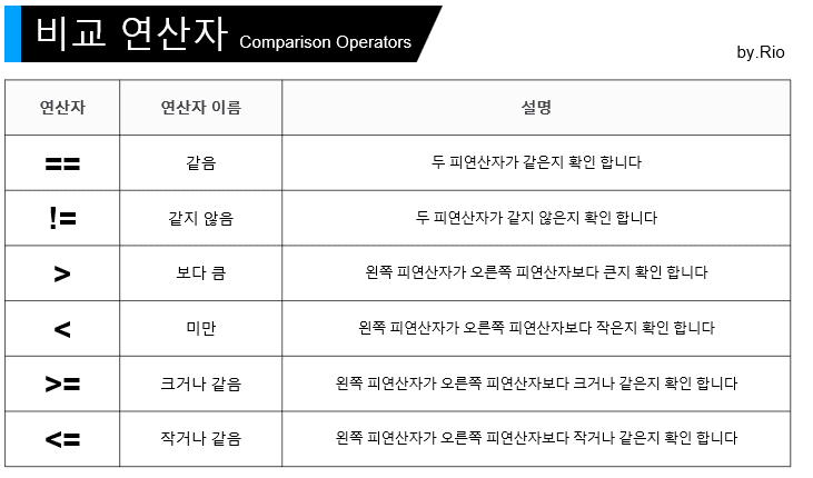 그럼 비교 연산자 의 종류는 어떻게 되고 기호는 무엇일까요? 다음과 같이 표로 알아보도록 하겠습니다.