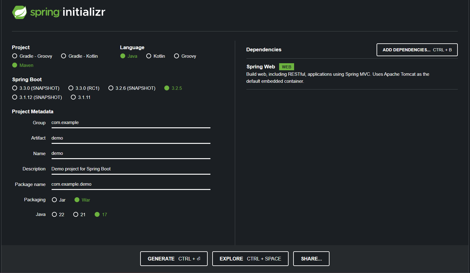 2. 필요한 프로젝트 메타데이터(예: Group, Artifact, Dependencies 등)를 입력합니다.